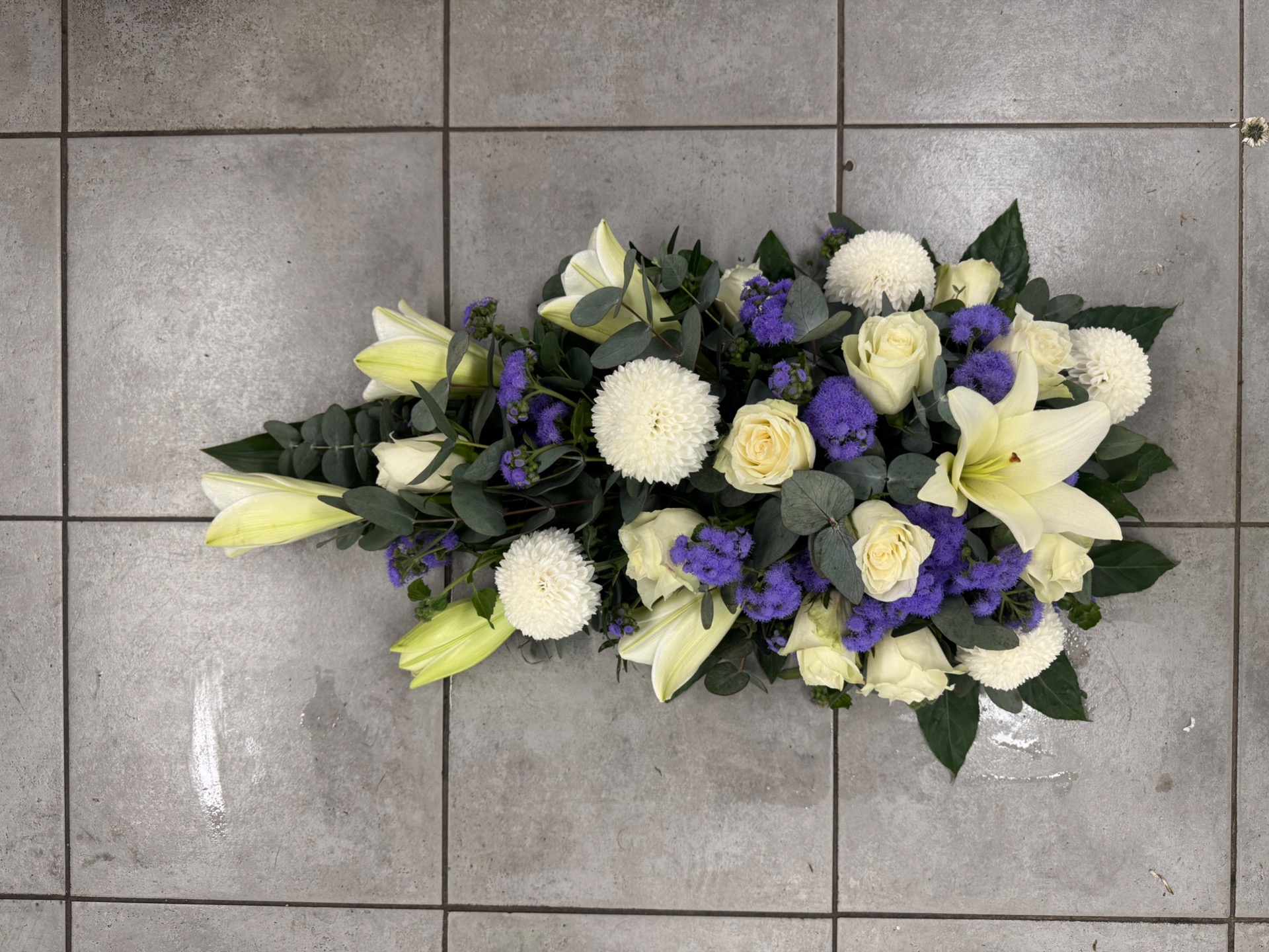 Valkoisten liljojen ja ruusujen kanssa sidottu sinisävyinen surulaite luo arvokkaan ja rauhallisen vaikutelman.